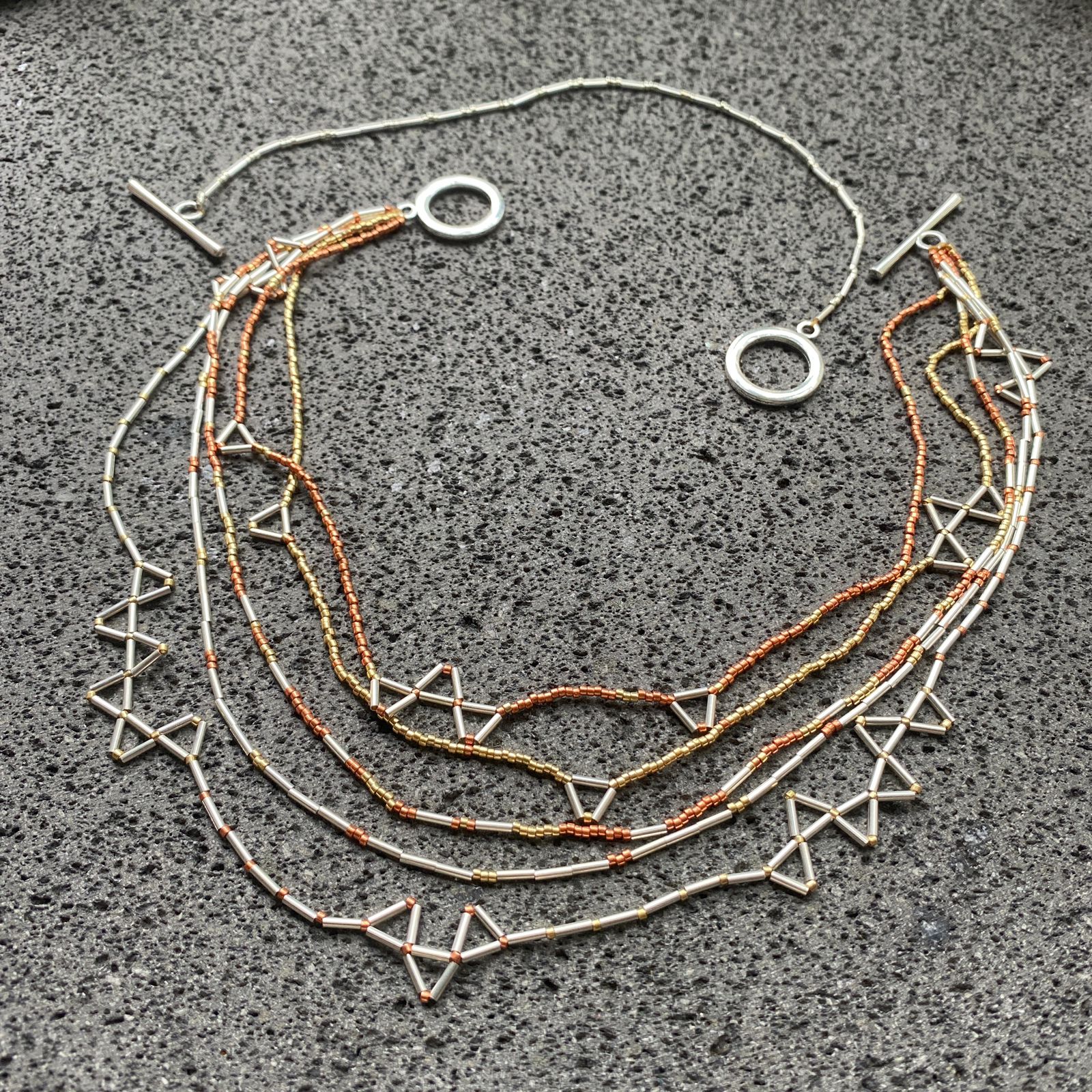 El collar Extensible esta hecho en colores Cobre, Dorado y Plateado. Tiene 5 líneas de largos diferentes mezclando perlas tubo plateadas y perlas cortas.