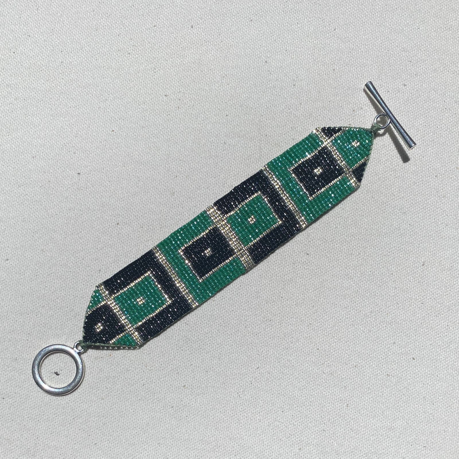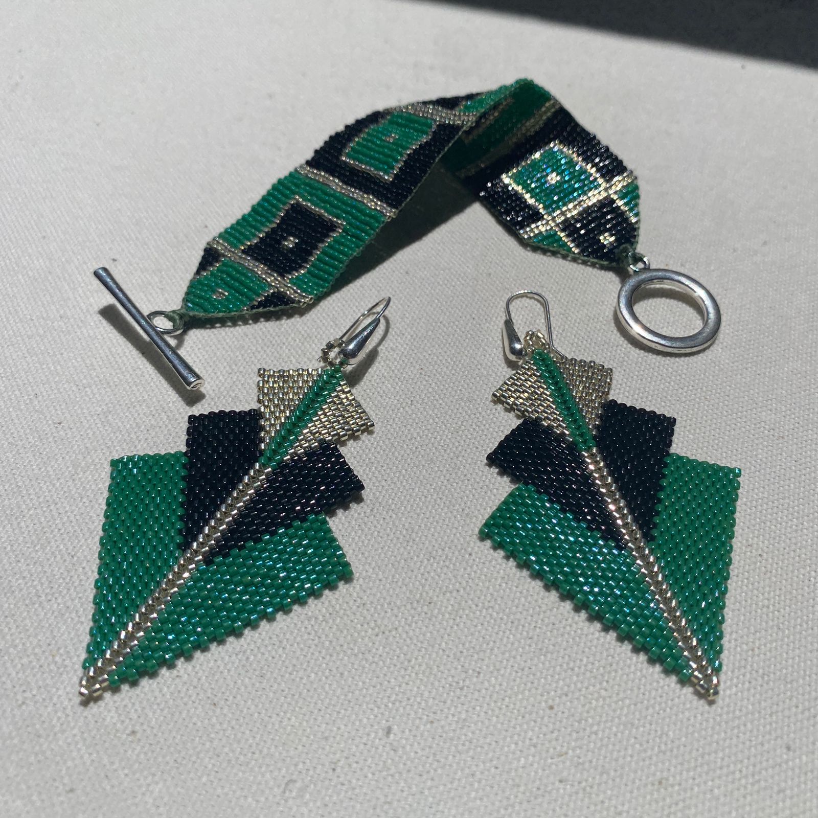 El conjunto Verde Esmeralda incluye los aretes modelo Danika con broches de plata 925 de Taxco y una Pulsera Cuadros con cierre plateado de acero inoxidable.