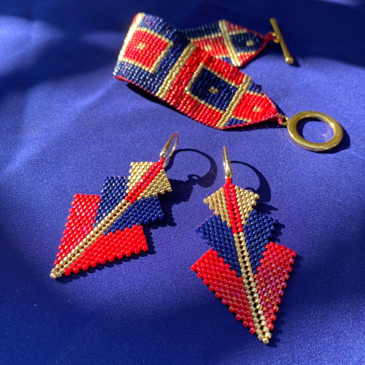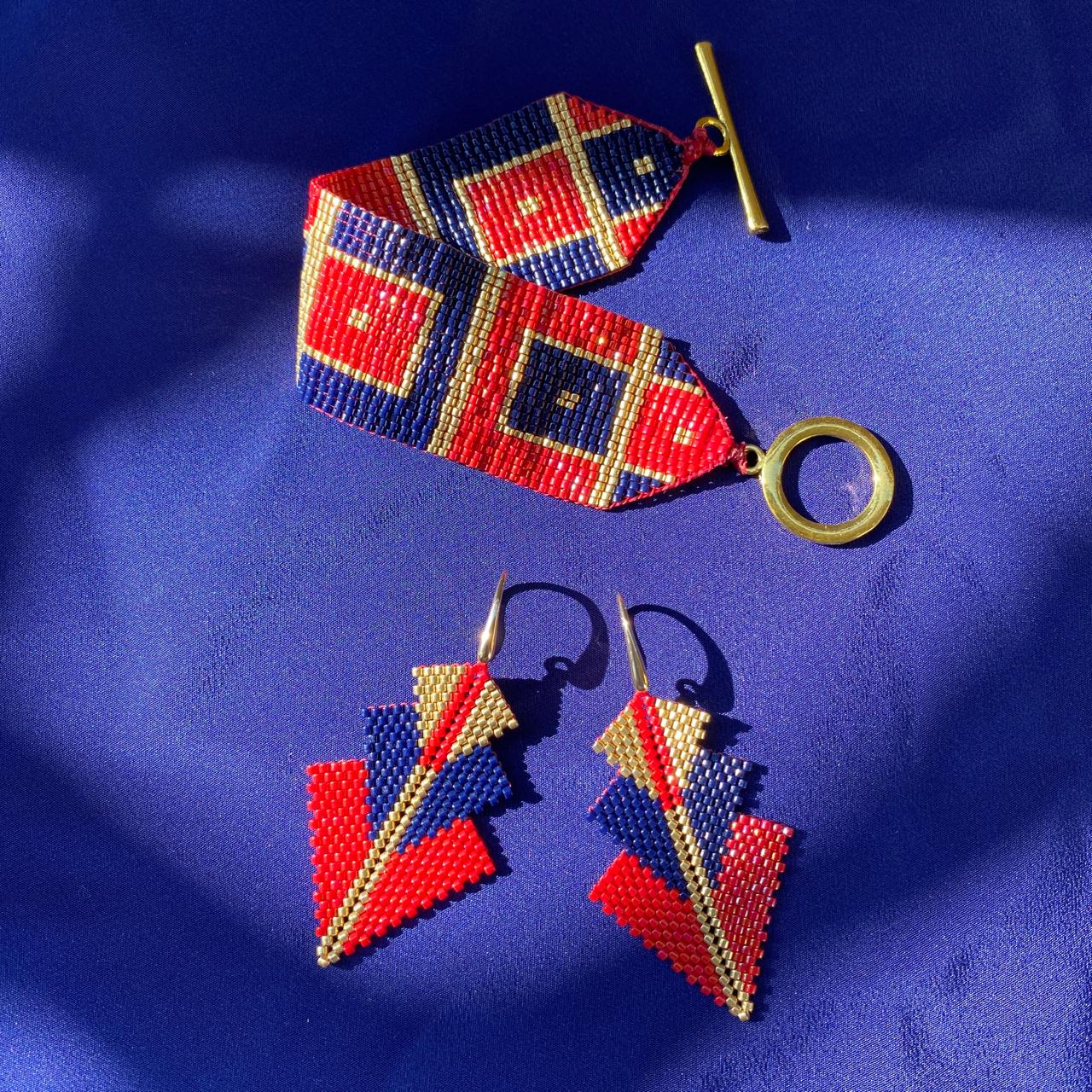 El conjunto Rojo incluye los aretes modelo Mini Rigel con broches de baño de oro y una Pulsera Art Déco Cuadros con cierre doradoo de acero inoxidable.