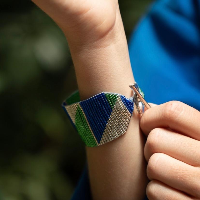 El conjunto Verde Limón, Azul y Plateado incluye los aretes modelo Rigel con broche de plata de Taxco y una Pulsera Geométrica con cierre plateado de acero inoxidable.
