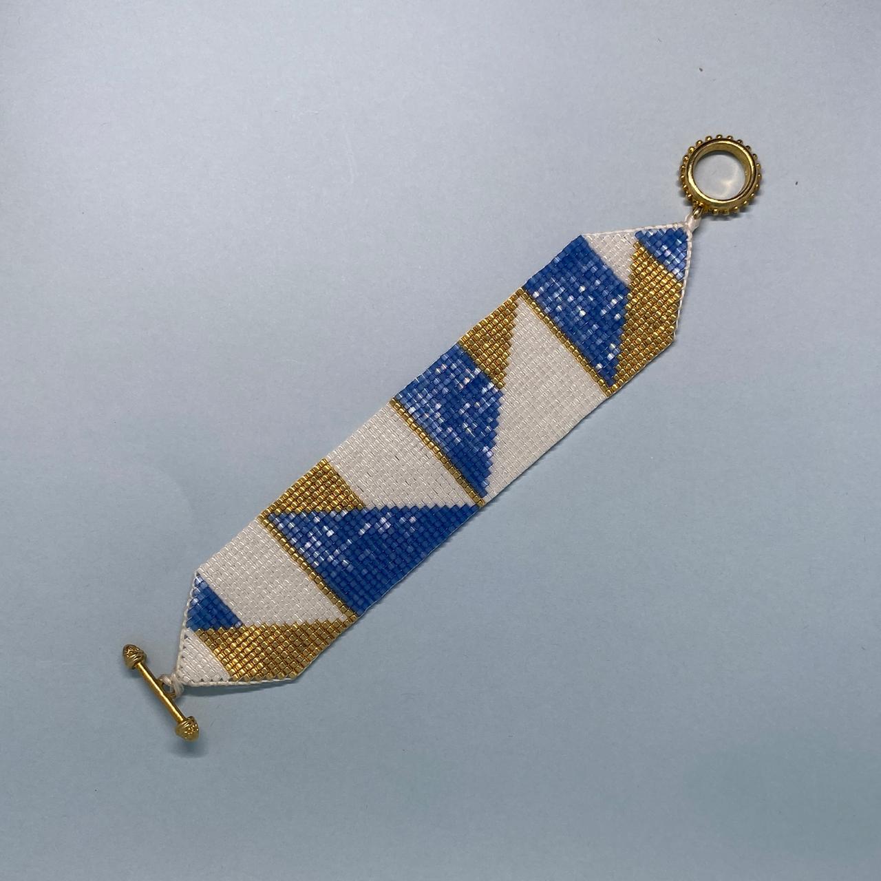 En AVA creamos piezas muy especiales, la pulsera Geométrica en color Azul Claro, Blanco y Dorado esta inspirada en los colores y formas geométricas del arte mexicano.