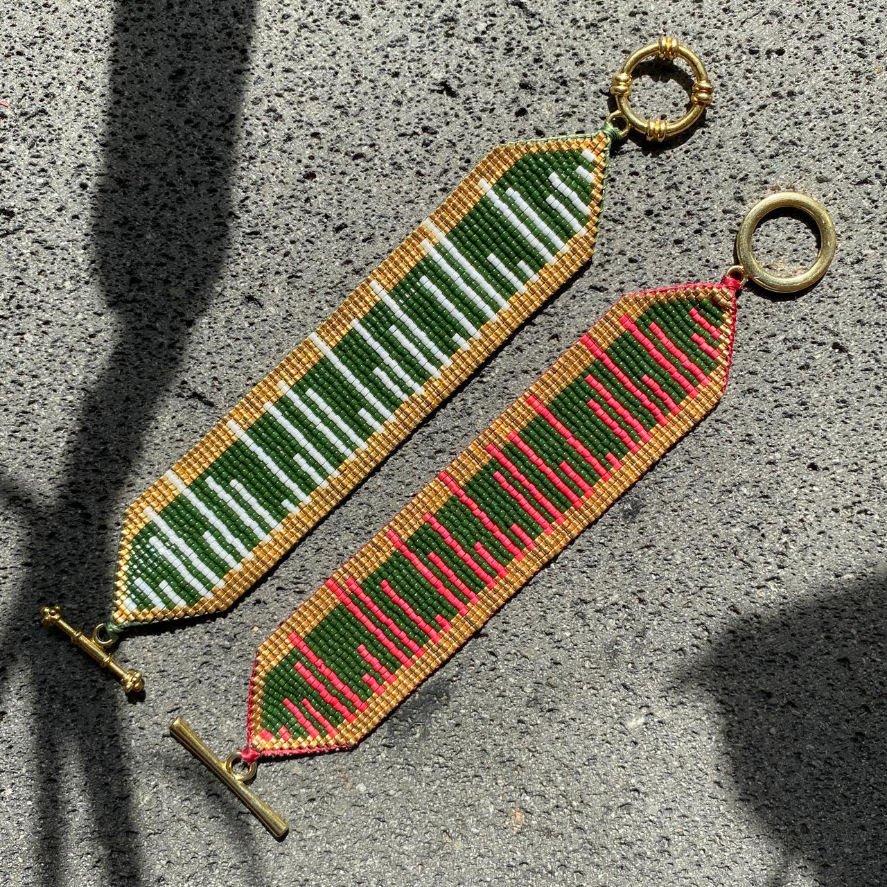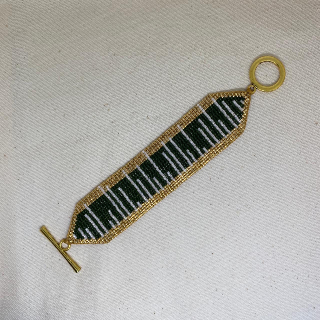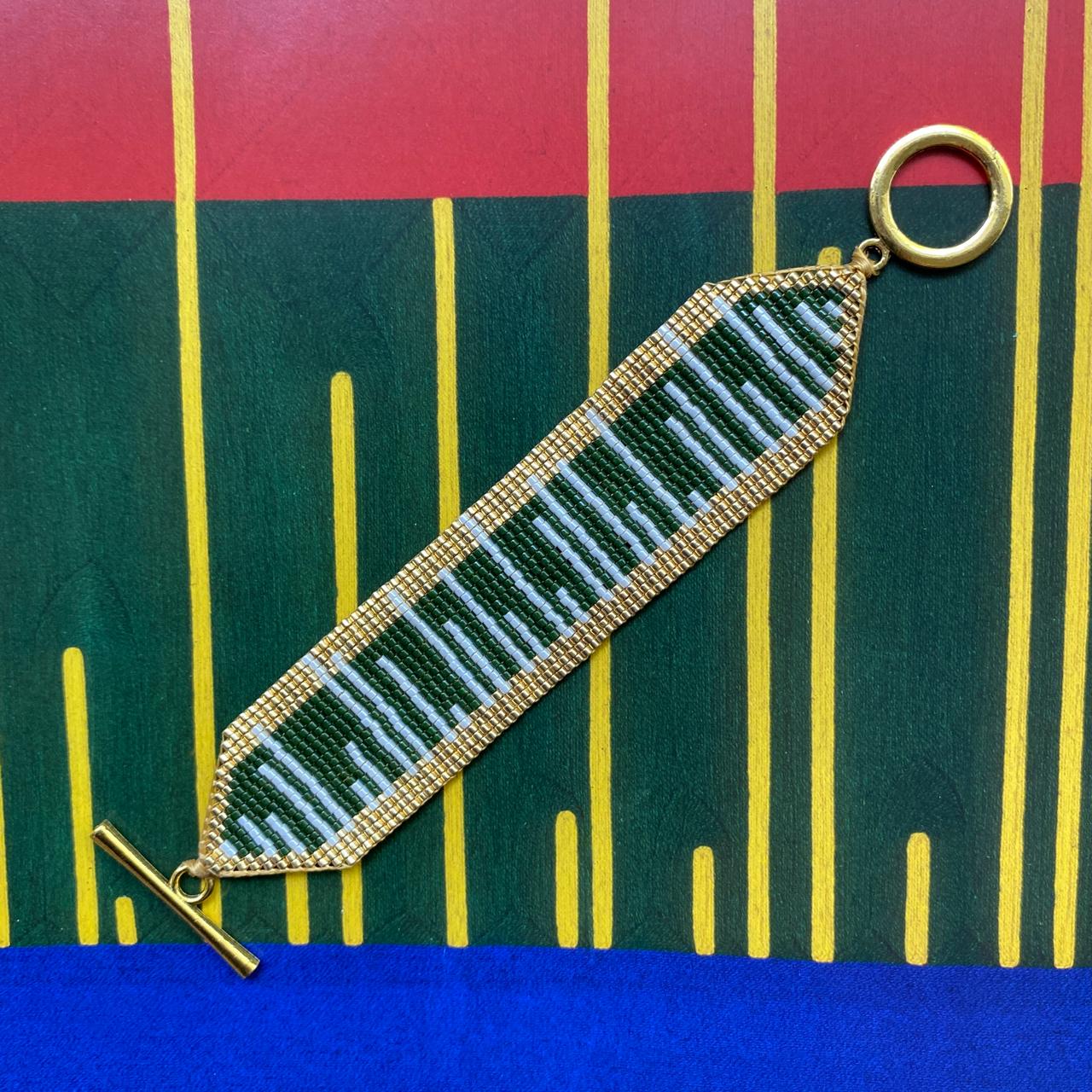 En AVA creamos piezas muy especiales, la pulsera Geométrica en color Verde Olivo, Blanco y Dorado esta inspirada en los colores y formas geométricas del arte mexicano.